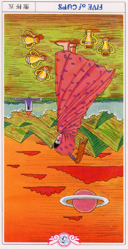 The 5 of Cups is about overcoming sadness and disappointment. You've let go of your old securities to embrace the new and exciting, now something has gone awry and you feel bad about that. But don't forget to notice those things that did go right.