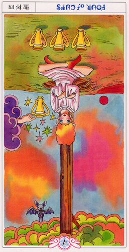 With the 4, the second cycle of this suit is commenced, where a choice between structure and feeling has to be made, where old securities have to be let go of to work towards a new future. But like Wands, Cups don't like structure much, they prefer to be free and dream rather than to make commitments and go for something.