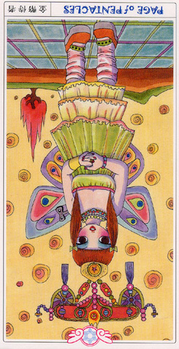 Pages explore and gather information about the road ahead, with an almost naive attitude. The Page of Pentacles is sometimes described as a bridge builder; Pentacles is the suit where the actual work is done, and the Page here enables those that follow to quickly cross difficult terrain.