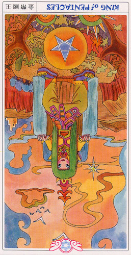 The King of Pentacles uses his Earthly attributes to rule. He goes about his work like an old style business man; he avoids unnecessary risks, aims for real results, and acts from confidence.