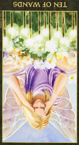 The 10 of Wands is therefore the transition from the element Fire (associated with Wands) to the element Water, associated with Cups. As you might imagine, this not the easiest of transitions.
