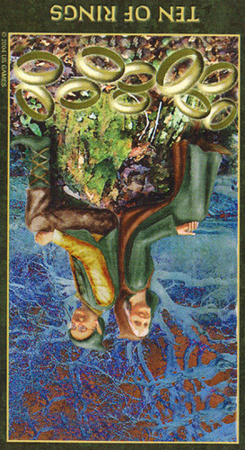 The 10 of Pentacles represents material posessions. The number 10 of Pentacles forms the links to the Ace (first card) of Wands (the first suit in the minor Arcana), and thus prepares to bring you back to the beginning of the minor Arcana, ready for a next cycle through the tarot.