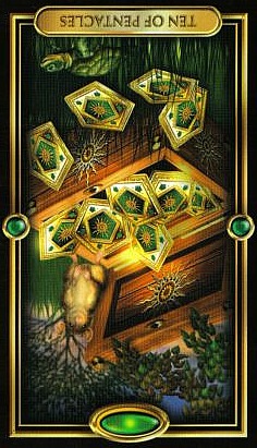The 10 of Pentacles represents material posessions. The number 10 of Pentacles forms the links to the Ace (first card) of Wands (the first suit in the minor Arcana), and thus prepares to bring you back to the beginning of the minor Arcana, ready for a next cycle through the tarot.
