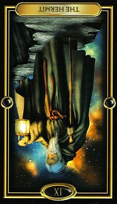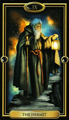 The Hermit shuts out the world and retreats into solitude to better understand some spiritual aspect of life. He opens to the cosmos and lets it's wisdom sink in. Hermits are often seen as wise old men who can guide a traveller along a journey.