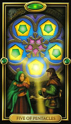 The 5 of Pentacles is an assignment-number card, and is about letting go of your securities. Pentacles element Earth (also) represents material posessions, so this card is about letting go of (some of) your worldly assets.