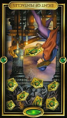 The 8 of Pentacles is about keeping up the hard work you're doing, and trying to be happy about doing that work at the same time. While the 3 of Pentacles is about completing a masterpiece, the 8 of Pentacles is about doing the apprentice work that makes you a master of your trade.