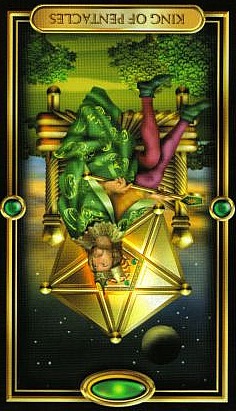 The King of Pentacles uses his Earthly attributes to rule. He goes about his work like an old style business man; he avoids unnecessary risks, aims for real results, and acts from confidence.