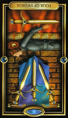 4 is the first number in the cycle of giving things shape. It's about making things real. The element of Swords also relates to making things real, so this enhances the effect so much that arrogance can cause you to exhaust yourself.