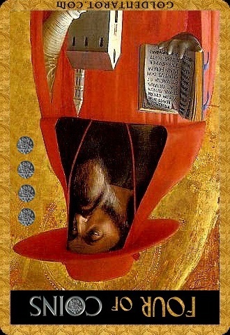 The 4 of Pentacles is about holding on to what you got. The number 4 represents structure and order, and fits well with the suit's element, Earth.