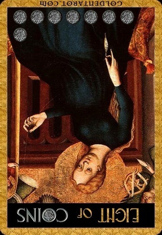 The 8 of Pentacles is about keeping up the hard work you're doing, and trying to be happy about doing that work at the same time. While the 3 of Pentacles is about completing a masterpiece, the 8 of Pentacles is about doing the apprentice work that makes you a master of your trade.