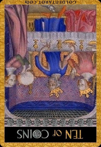 The 10 of Pentacles represents material posessions. The number 10 of Pentacles forms the links to the Ace (first card) of Wands (the first suit in the minor Arcana), and thus prepares to bring you back to the beginning of the minor Arcana, ready for a next cycle through the tarot.