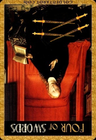 4 is the first number in the cycle of giving things shape. It's about making things real. The element of Swords also relates to making things real, so this enhances the effect so much that arrogance can cause you to exhaust yourself.