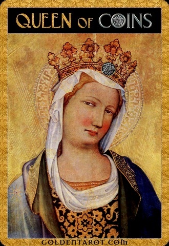 The Queen in the suit of Pentacles becomes aware of her Earthly attributes; she's reliable and sober, able to give good advice.
