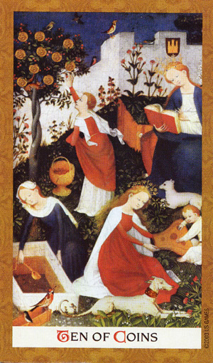 The 10 of Pentacles represents material posessions. The number 10 of Pentacles forms the links to the Ace (first card) of Wands (the first suit in the minor Arcana), and thus prepares to bring you back to the beginning of the minor Arcana, ready for a next cycle through the tarot.