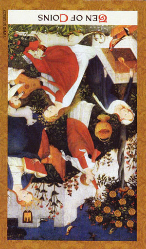 The 10 of Pentacles represents material posessions. The number 10 of Pentacles forms the links to the Ace (first card) of Wands (the first suit in the minor Arcana), and thus prepares to bring you back to the beginning of the minor Arcana, ready for a next cycle through the tarot.
