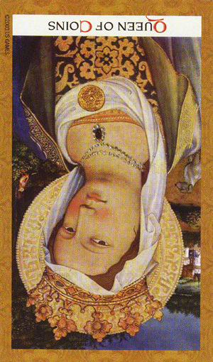 The Queen in the suit of Pentacles becomes aware of her Earthly attributes; she's reliable and sober, able to give good advice.