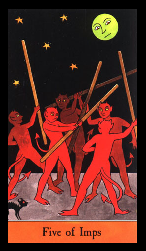 The 5 of Wands represents competition. The 5 is the second assignment number, and therefore a difficult card. 5 combined with the Wand's element fire challenges you. You'll have to fight hard for your idea, but you stand a good chance of succeeding.