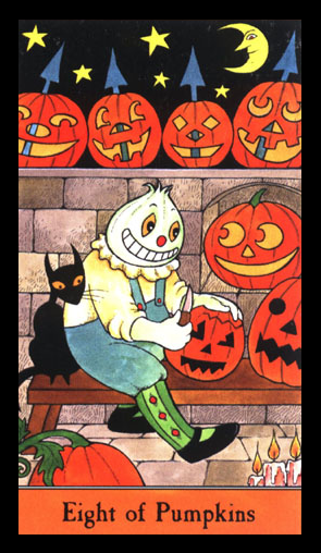 The 8 of Pentacles is about keeping up the hard work you're doing, and trying to be happy about doing that work at the same time. While the 3 of Pentacles is about completing a masterpiece, the 8 of Pentacles is about doing the apprentice work that makes you a master of your trade.