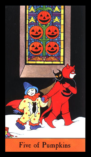 The 5 of Pentacles is an assignment-number card, and is about letting go of your securities. Pentacles element Earth (also) represents material posessions, so this card is about letting go of (some of) your worldly assets.