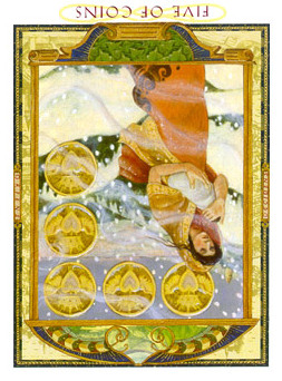 The 5 of Pentacles is an assignment-number card, and is about letting go of your securities. Pentacles element Earth (also) represents material posessions, so this card is about letting go of (some of) your worldly assets.