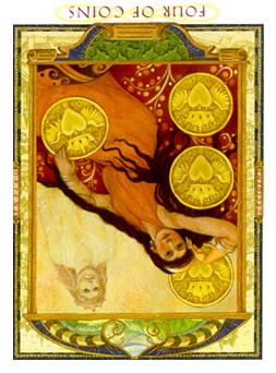 The 4 of Pentacles is about holding on to what you got. The number 4 represents structure and order, and fits well with the suit's element, Earth.