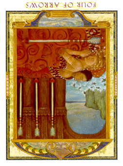 4 is the first number in the cycle of giving things shape. It's about making things real. The element of Swords also relates to making things real, so this enhances the effect so much that arrogance can cause you to exhaust yourself.