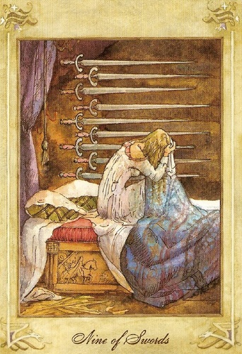 The 9 of Swords represents relief from cropped-up grief. The number 9 is a number of reward and rest and accomplishment. In the element of Swords there is not a lot of time for rest, but without any rest you'd just burn yourself out.