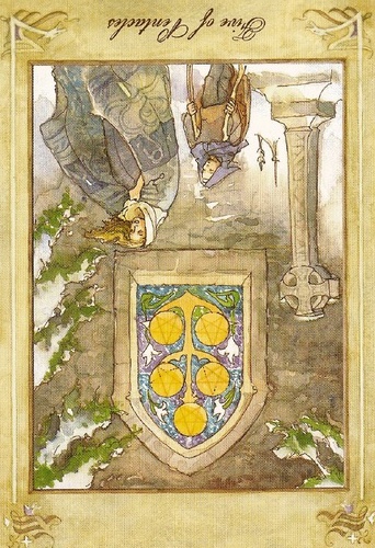 The 5 of Pentacles is an assignment-number card, and is about letting go of your securities. Pentacles element Earth (also) represents material posessions, so this card is about letting go of (some of) your worldly assets.