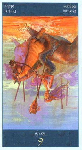 The 10 of Wands is therefore the transition from the element Fire (associated with Wands) to the element Water, associated with Cups. As you might imagine, this not the easiest of transitions.