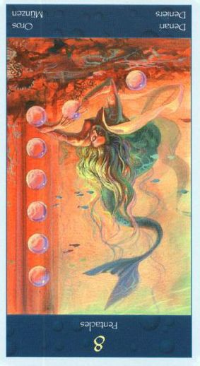 The 8 of Pentacles is about keeping up the hard work you're doing, and trying to be happy about doing that work at the same time. While the 3 of Pentacles is about completing a masterpiece, the 8 of Pentacles is about doing the apprentice work that makes you a master of your trade.
