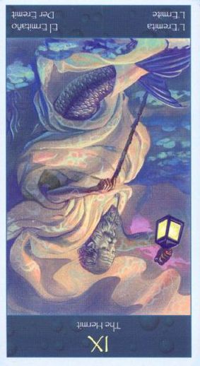 The Hermit shuts out the world and retreats into solitude to better understand some spiritual aspect of life. He opens to the cosmos and lets it's wisdom sink in. Hermits are often seen as wise old men who can guide a traveller along a journey.