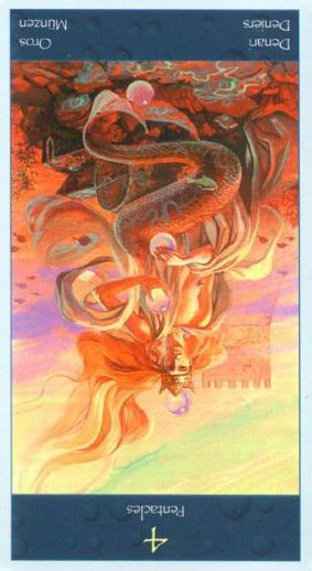 The 4 of Pentacles is about holding on to what you got. The number 4 represents structure and order, and fits well with the suit's element, Earth.