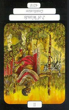 The 2 of Wands represents the research and digestion of a new idea. The number of this card and it's element are somewhat in conflict; while the 2 is focussed inwards, the Wand's element fire is outgoing. Fire wants to steam ahead while the blackbox 2 asks for patience.