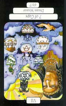 The 7 of Cups is about making a choice between different ideals. But Cups, with the water element, don't like making definitive choices that much, making this 7 in this suit a bit of a hard choice.