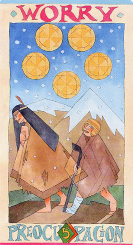 The 5 of Pentacles is an assignment-number card, and is about letting go of your securities. Pentacles element Earth (also) represents material posessions, so this card is about letting go of (some of) your worldly assets.