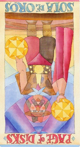 Pages explore and gather information about the road ahead, with an almost naive attitude. The Page of Pentacles is sometimes described as a bridge builder; Pentacles is the suit where the actual work is done, and the Page here enables those that follow to quickly cross difficult terrain.