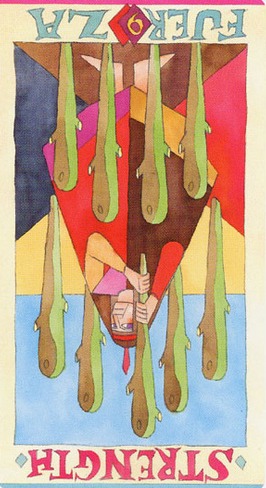 The 9 represents rest after work, which is another thing (like 8) that the element Fire associated with Wands is not very comfortable with. Fire likes to keep going. This rest will probably be spent thinking about what to do next along the course to completion.