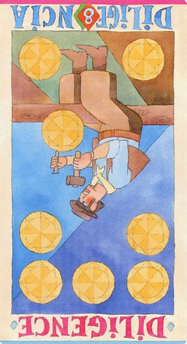 The 8 of Pentacles is about keeping up the hard work you're doing, and trying to be happy about doing that work at the same time. While the 3 of Pentacles is about completing a masterpiece, the 8 of Pentacles is about doing the apprentice work that makes you a master of your trade.