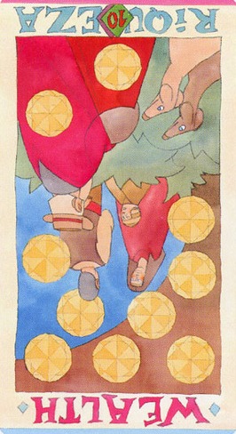 The 10 of Pentacles represents material posessions. The number 10 of Pentacles forms the links to the Ace (first card) of Wands (the first suit in the minor Arcana), and thus prepares to bring you back to the beginning of the minor Arcana, ready for a next cycle through the tarot.