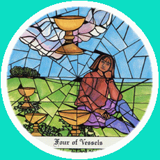 With the 4, the second cycle of this suit is commenced, where a choice between structure and feeling has to be made, where old securities have to be let go of to work towards a new future. But like Wands, Cups don't like structure much, they prefer to be free and dream rather than to make commitments and go for something.