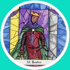 This card carries the number 11. In the Rider-Waite deck, Strength and Justice have swapped places because Waite saw links with the astrological signs Leo and Libra.