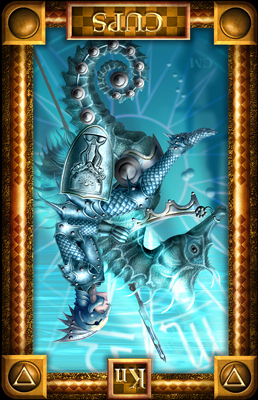The King of Cups uses his intuition to achieve his ideals. Since Cups are turned inward, and Kings turned to the outside world, this card might be a difficult one, or it could be a powerful one.