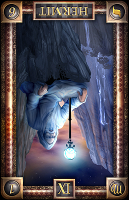 The Hermit carries the number 9. This is the highest base number. After 9 the composed numbers emerge. Therefore the number 9 is the gateway to a higher order. It is also a place to rest before embarking on the next leg of the journey.