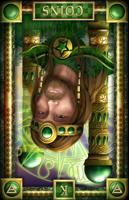 The King of Pentacles uses his Earthly attributes to rule. He goes about his work like an old style business man; he avoids unnecessary risks, aims for real results, and acts from confidence.