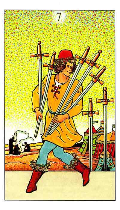 The 7 of Swords is about making slow progress because you can't trust the situation and/or people around you.