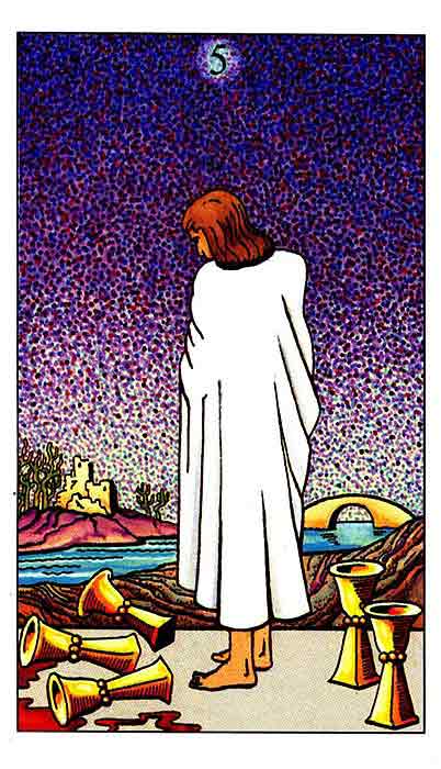 The 5 of Cups is about overcoming sadness and disappointment. You've let go of your old securities to embrace the new and exciting, now something has gone awry and you feel bad about that. But don't forget to notice those things that did go right.