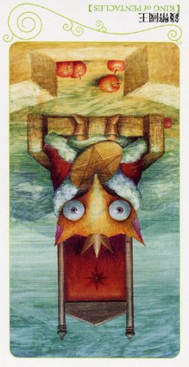 The King of Pentacles uses his Earthly attributes to rule. He goes about his work like an old style business man; he avoids unnecessary risks, aims for real results, and acts from confidence.