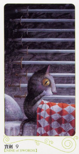 The 9 of Swords represents relief from cropped-up grief. The number 9 is a number of reward and rest and accomplishment. In the element of Swords there is not a lot of time for rest, but without any rest you'd just burn yourself out.