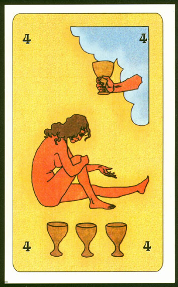 With the 4, the second cycle of this suit is commenced, where a choice between structure and feeling has to be made, where old securities have to be let go of to work towards a new future. But like Wands, Cups don't like structure much, they prefer to be free and dream rather than to make commitments and go for something.