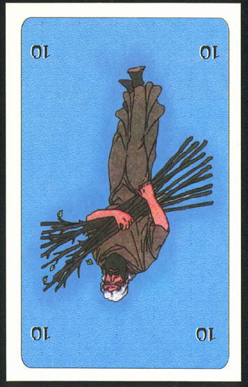 The 10 of Wands is therefore the transition from the element Fire (associated with Wands) to the element Water, associated with Cups. As you might imagine, this not the easiest of transitions.